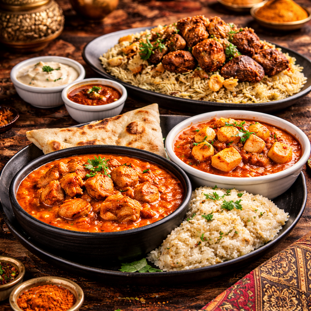 Authentic Indian dishes such as Chicken Tikka Masala, Butter Chicken, Biryani, Paneer, and Lamb favorites.