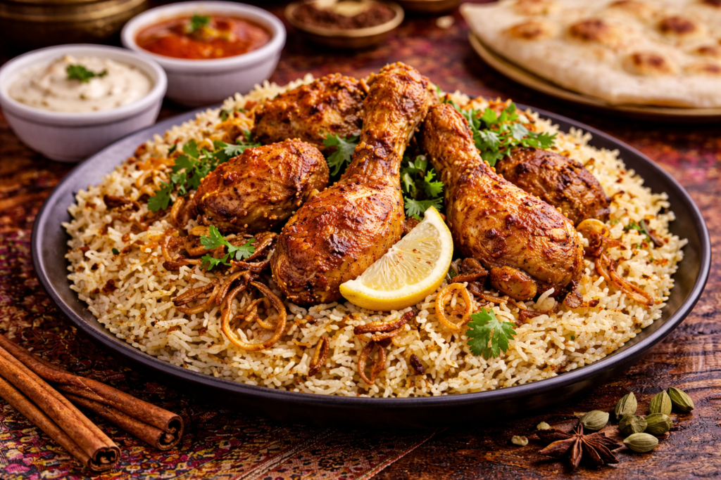 Aromatic rice, spiced chicken